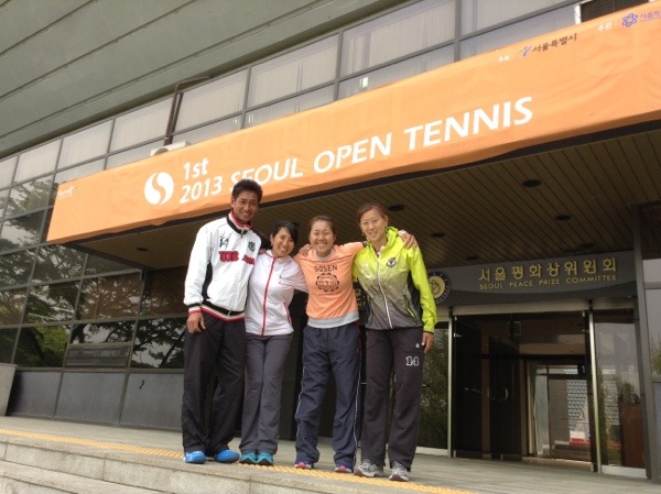 朝から練習。 いろいろな点に注意しながらショットを打っていますが、 なかなか思い通りにいきません(^^;; 1日でも早く、質の良いショットを打てるようになりたいものです。 チーム河内庭球倶楽部。 左から、柏谷好希コーチ、私、高畑寿弥選手、川崎好美選手。 皆頑張っています。 明日は、予選のサインです。
